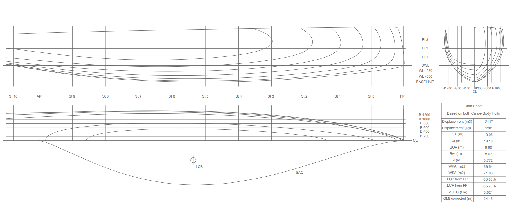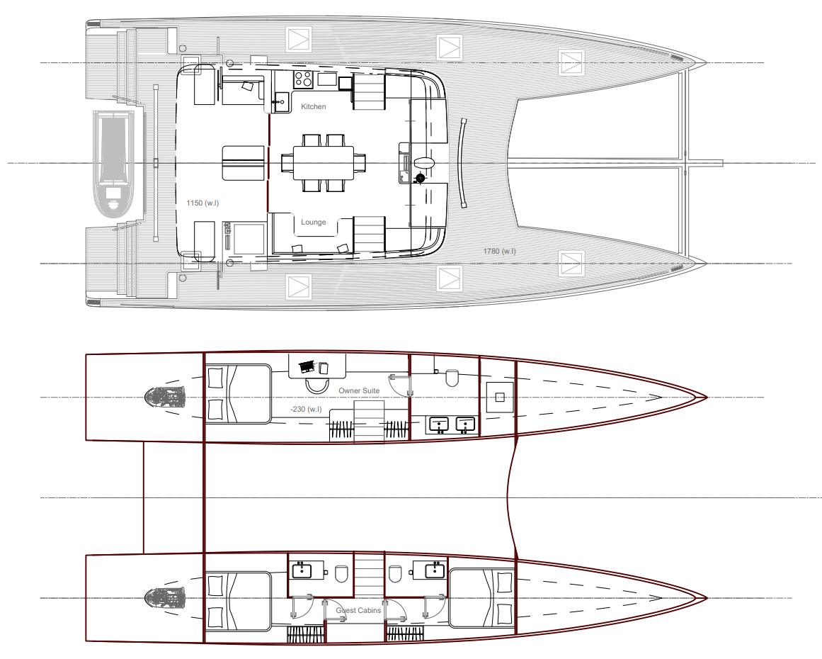 My university dissertation examined the practicality, performance benefits, and safety implications of asymmetric foils for cruising catamarans. The research quantified the performance gains of an asymmetric, swivelling daggerboard deployed on the leeward hull, benchmarked against conventional twin symmetric foils used upwind. The general arrangement was developed to ensure the swivelling daggerboard could be practically installed within skegs at the bottom of the hull. Heeling moments and structural failures were assessed to ensure safety for the crew at all times.
